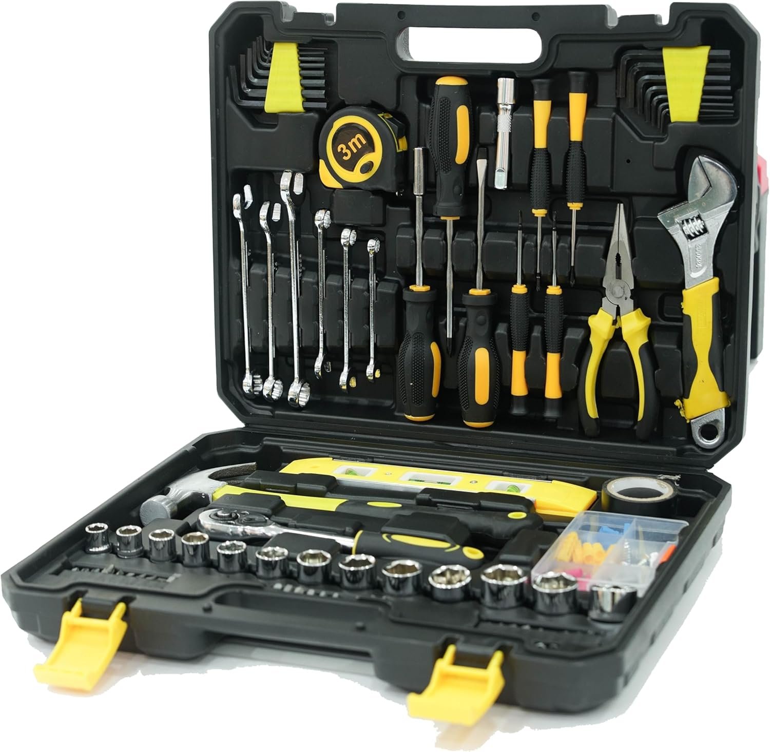 - 【Precision & Versatility】Features a 3-meter tape measure, hex keys, bit sets, sockets, dual-purpose wrench, and a precision screwdriver set, making this kit ideal for both small and large repair tasks.