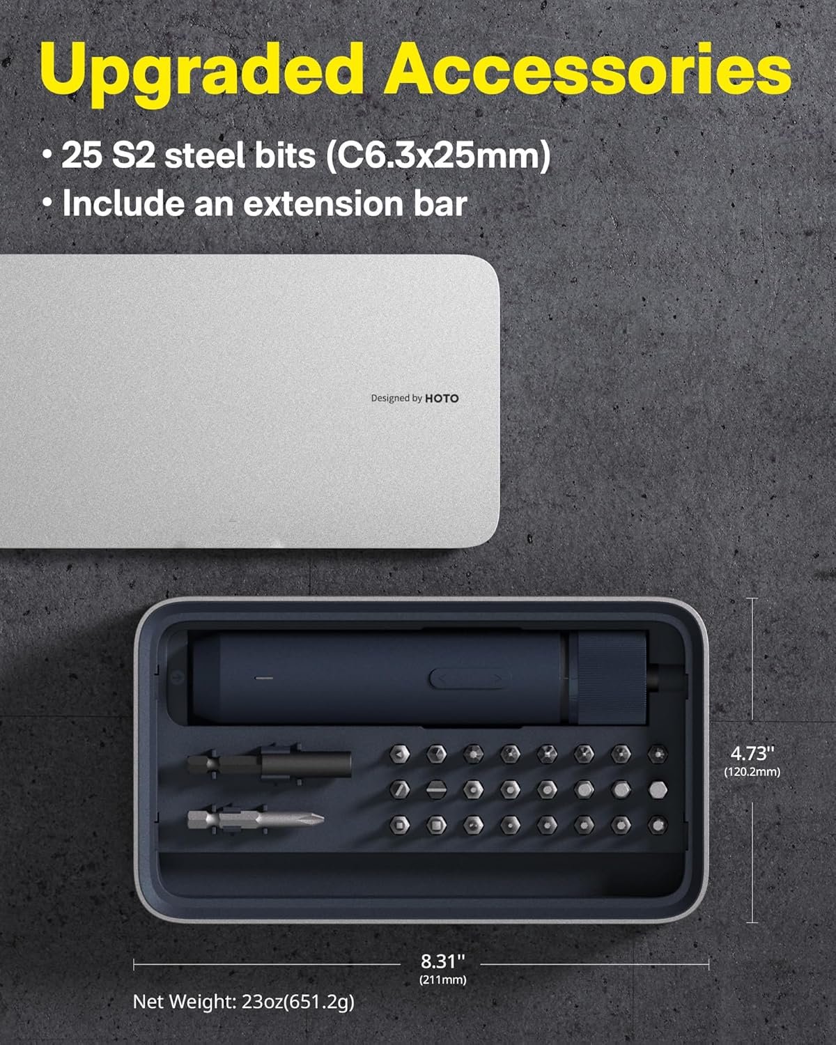 • Complete All-in-One Set: Includes 1 electric screwdriver, 1 extension rod (60mm), 24 S2 bits (C6.3 x 25mm), 1 PH2 extended bit (C6.3 x 50mm), and 1 magnetic storage case. A well-designed toolkit that combines practicality with a sleek modern appearance. Note that charging cable is not included