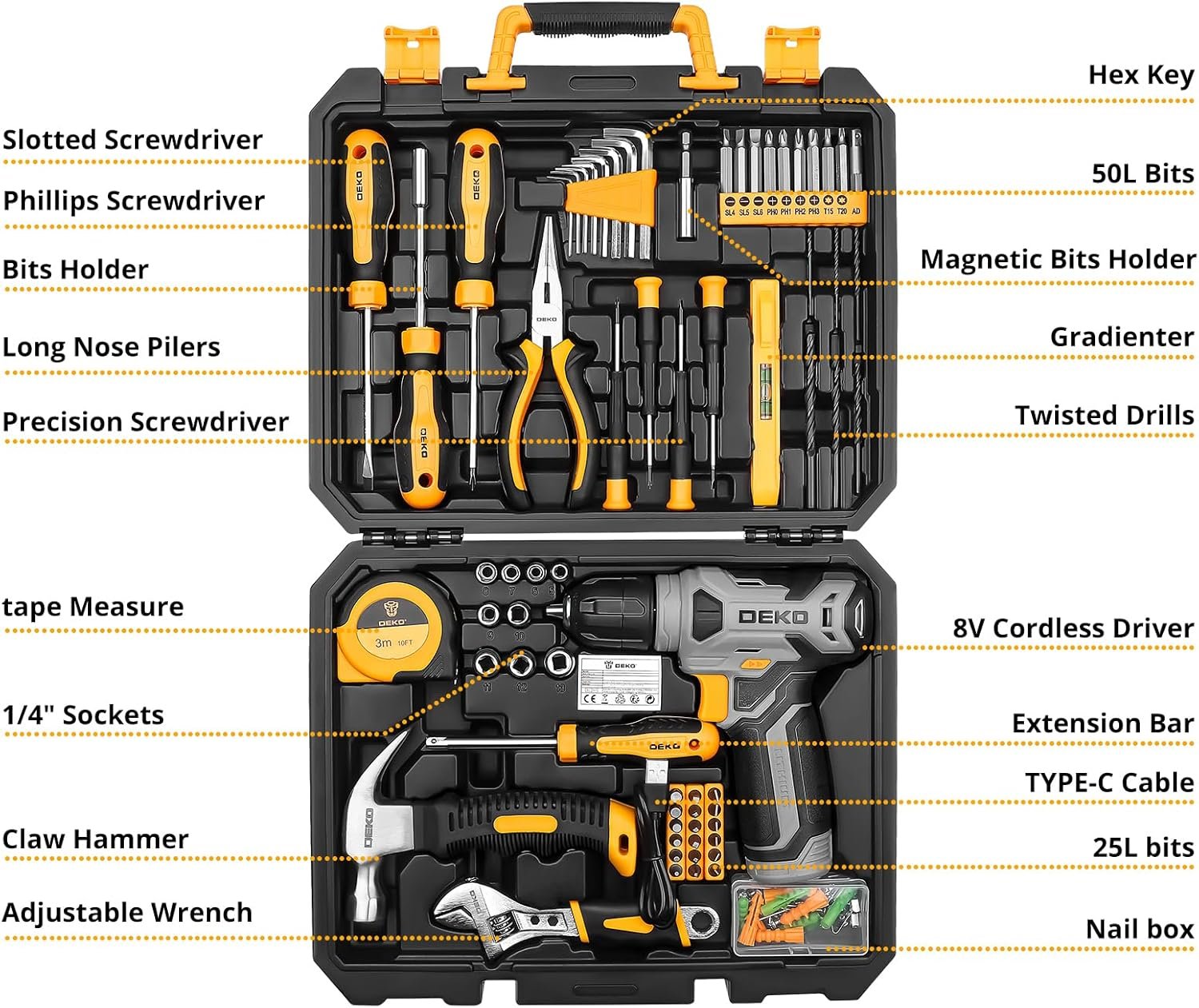 - PACKAGE INCLUDED—1 *8V CORDLESS DRIVER; 1 *hex nut screwdriver; 2 *Screwdriver; 4 *precision Screwdriver; 6 *twisted drills; 8 *hex key; 1 *magneitc bits holder; 10 *50L bits; 18 *25I bits; 9 *1/4″ sockets; 1 *Measure Tape Ruler; 50 *fasteners; 1 *claw hammer; 1 *adjustable wrench ; 1 *Long Nose Pilers; 1 * User Manual